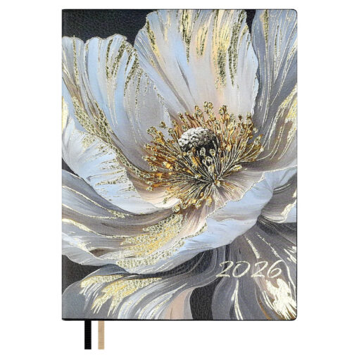 Ежедневник датированный 2026 ESCALADA, А6+, 176 л., арт. 70310/ 20 БЕЛЫЙ МАК (кожзам: 126х174 мм, мягкий переплёт, запаянный край, материал обложки: искусственная кожа «Наппа»; декор: печать полноцветная, тиснение фольгой; способ крепления блока: ниткошвейный; вн. блок: 176 л., кремовый офсет 70 г/м², печать в две краски (линия), справочный материал: есть; перфорация углов блока: нет; отделка среза: окрашивание пантоном; закладка/-и: два ляссе; каптал: есть; форзац: печать в одну краску; персонализация возможна: нет; индивидуальная упаковка: промостикер + ПЭТ-пакет)