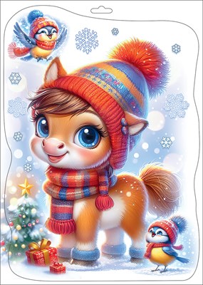 Новогодние наклейки на окна А4 Пони в шапочке 1469