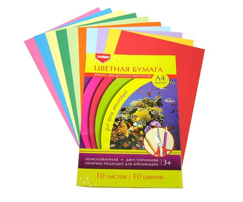 Цветная бумага 10л 10цв А4 2-х сторонняя, немелованная INTELLIGENT в папке BO-2