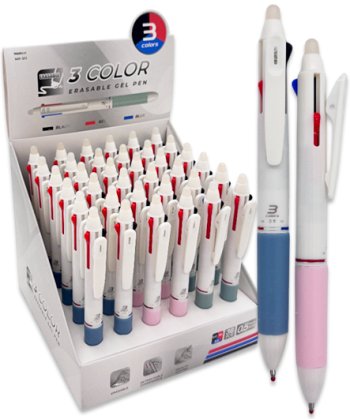 Ручка «Пиши стирай» автоматическая 3хцветная в белом корпусе с цветным резиновым грипом. Чернила обесцвечиваются при трении. Достаточно потереть надпись резинкой, расположенной на конце ручки, и надпись исчезнет.