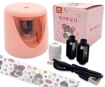 Точилка с розовым пластиковым корпусом и прочным прямым лезвием. Механизм приходит в движение при помощи электричества от 2х батареек АА (в комплект не входят) или USB-провода (в комплекте).