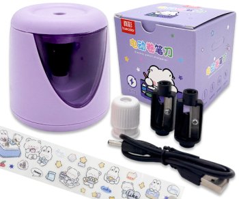 Точилка с фиолетовым пластиковым корпусом и прочным прямым лезвием. Механизм приходит в движение при помощи электричества от 2х батареек АА (в комплект не входят) или USB-провода (в комплекте).