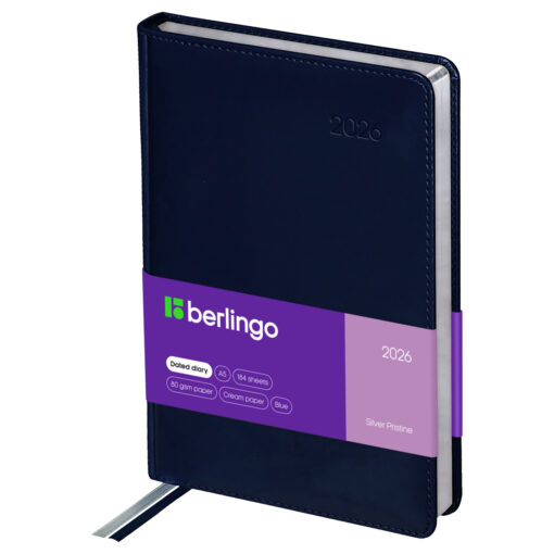 Датированный ежедневник на 2026 год Berlingo «Silver Pristine» формата А5 идеален для повседневного использования. Модель представлена с твердой обложкой из экокожи и поролоновой прослойкой. Сочетание серебряного фольгированного среза и синей обложки делает ежедневник элегантной деталью делового образа.