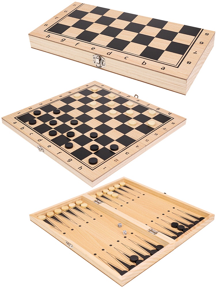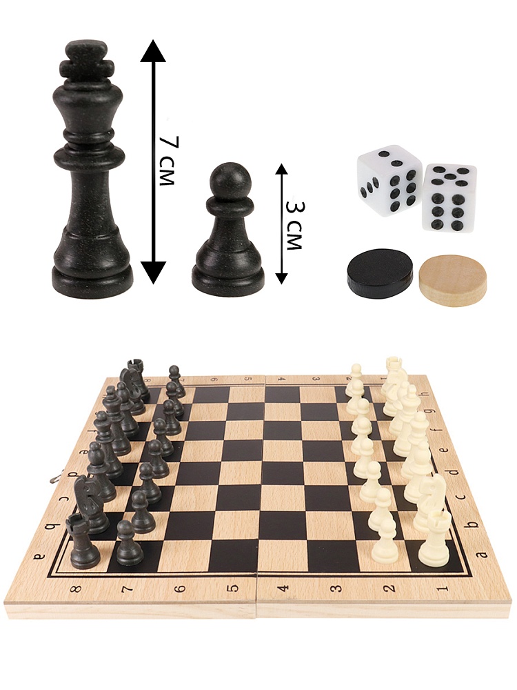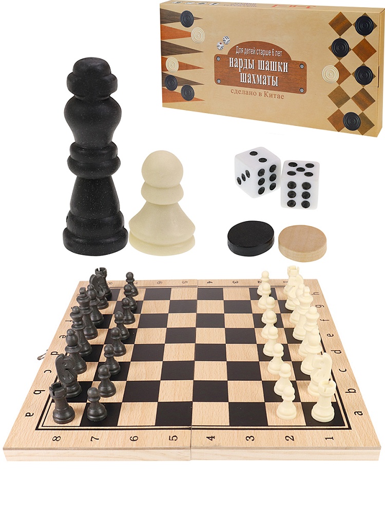 Набор настольных игр поможет приятно провести время и потренировать мозг. Нарды, шахматы и шашки благоприятно сказываются на развитии детей и взрослых. А секрет популярности этих настольных игр заключается в гениальной простоте их правил и огромных возможностях комбинаций. Проводите досуг с пользой! Размеры фигур: король 6,6×2,1 см, пешка 3,1×1,7 см. Размер поля: 34х17х3,5 см. Шахматные фигуры из палстика. Шашки из дерева.