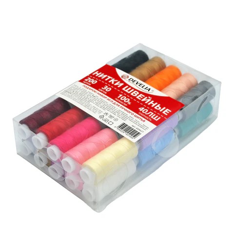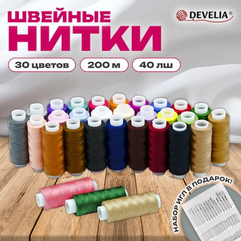 Нитки швейные 40ЛШ 200 м, полиэстер, НАБОР 30 цветов, в ПОДАРОК набор игл, DEVELIA (Девелия), 609627