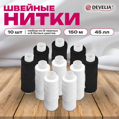 Нитки швейные 45ЛЛ 150 м, полиэстер, НАБОР 10 штук, 5 белых/5 черных, DEVELIA (Девелия), 609619