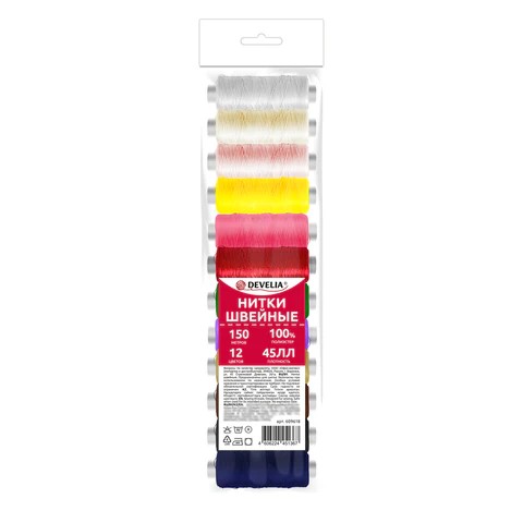Нитки швейные 45ЛЛ 150 м, полиэстер, НАБОР 12 цветов, DEVELIA (Девелия), 609618
