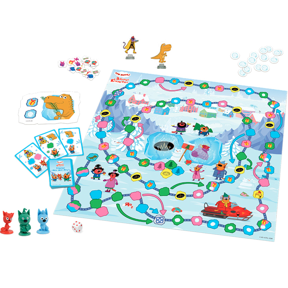 Комплектация: игровое поле — 1 шт., фигурка кота — 3 шт., фишка Рыки — 1 шт., фишка доктора Шока — 1 шт., кубик — 1 шт., карточки — 21 шт., жетоны снежков — 19 шт., жетоны подарков — 23 шт., правила игры