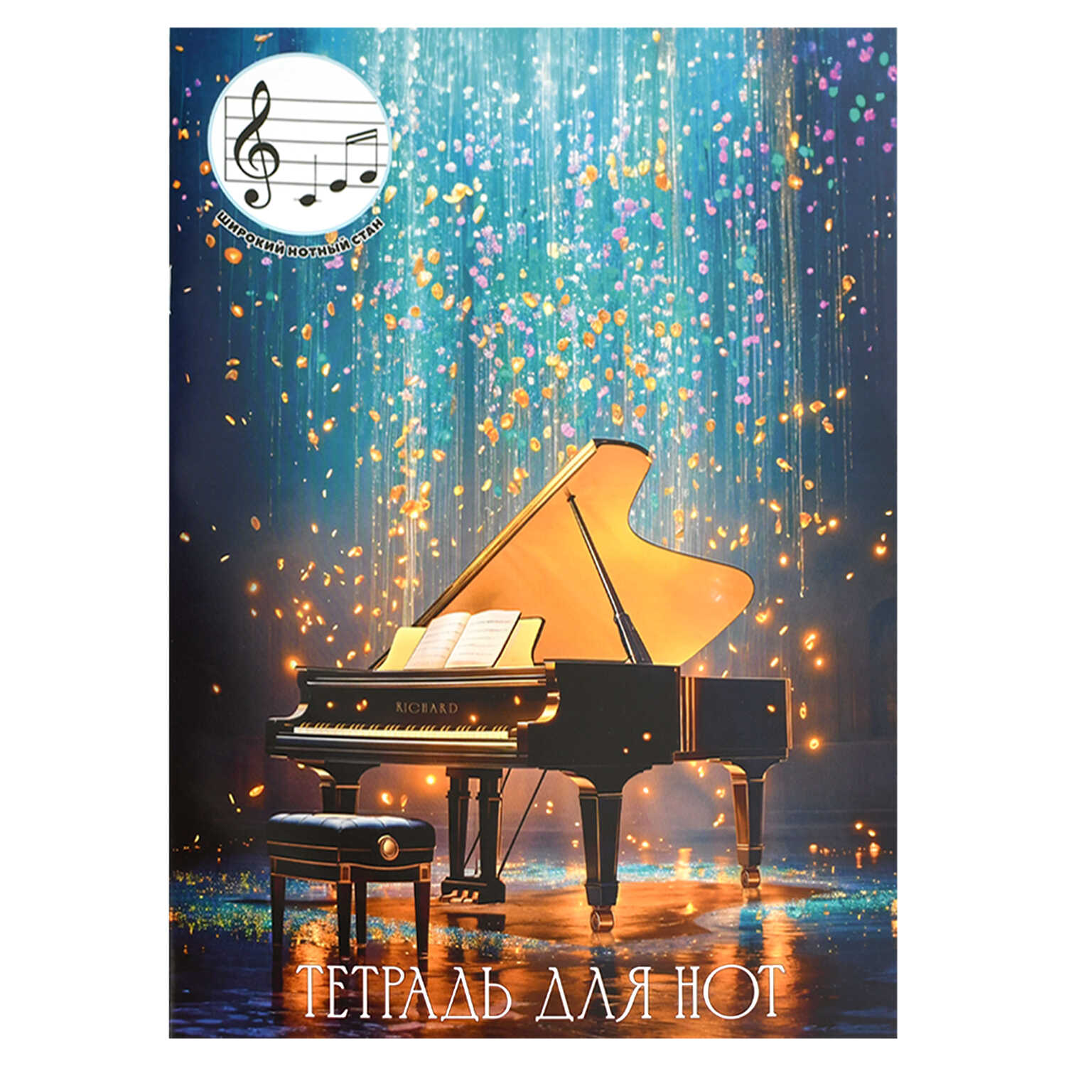Тетрадь для нот 12 л. арт. 70017 РОЯЛЬ В СИЯНИИ /А4, белый офсет, мягкий переплёт (2 скобы), облож.- мелованная бумага 115 г/м², широкий нотный стан.
