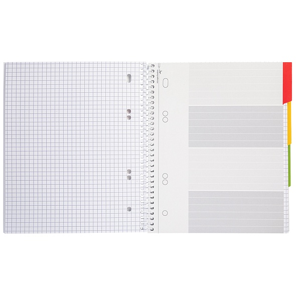 Тетрадь А5 формата 120 листов.Обложка: ламинированный пленкой Soft-touch картон.Внутренний блок: офсет 65 гр., серая клетка, многоуровневая перфорация, 3 цветных разделителя. Скрепление: спираль.Тетрадь предназначена для записей, подойдет для старшей школы, вуза, дома и офиса. Разноцветные картонные разделители внутреннего блока помогут разбить информацию на 4 тематических раздела. Внутренний блок имеет микроперфорацию на отрыв и универсальную перфорацию для подшивки листов в папку. Скрепление ‘спираль’ позволяет раскрывать тетрадь на 360 градусов.