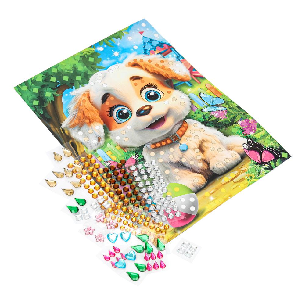 При помощи этого набора маленькая художница сможет создать блестящую картину с изображением очаровательного щенка, декорированную сверкающими стразами разных форм и размеров. Готовая поделка станет отличным вариантом для подарка близким или для украшения интерьера детской комнаты.