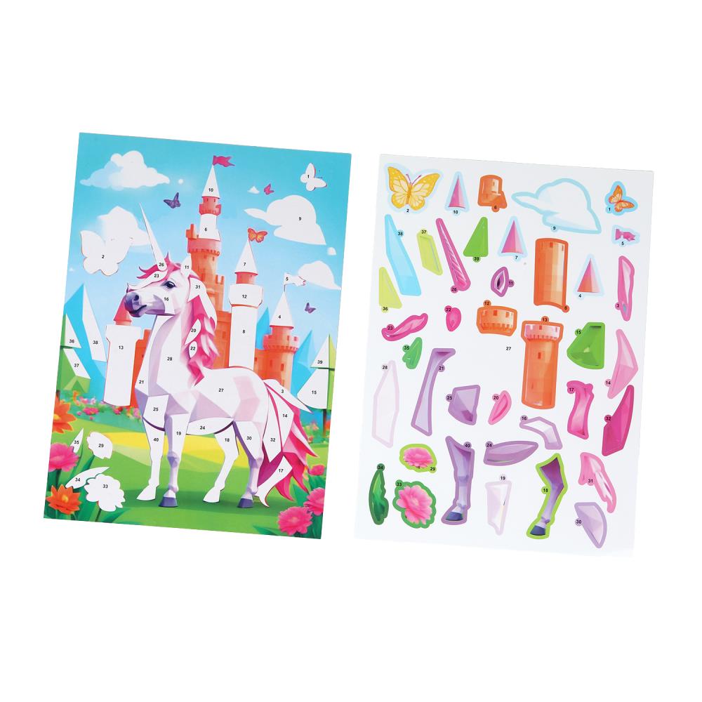 Задача маленьких рукодельников — подобрать недостающие элементы аппликации, которые представлены в виде наклеек. Заполнив основу нужными стикерами, ребёнок получит в результате красивую аппликацию с изображением прекрасного единорога. Готовую поделку можно использовать для украшения интерьера. Набор отлично подойдёт в качестве подарка девочкам на любой праздник.