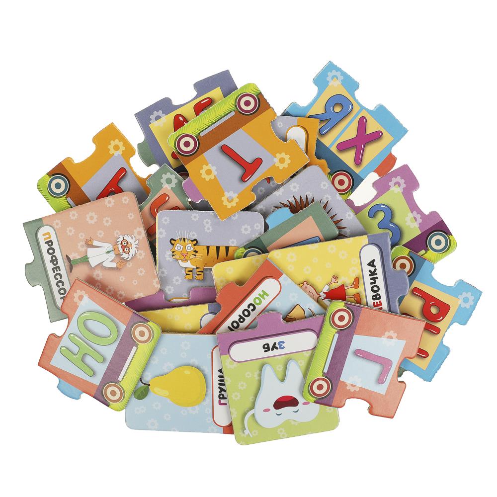 Благодаря входящим в данный набор пазлам, которые собираются в забавные вагончики, маленький любознайка в лёгкой игровой форме сможет выучить буквы русского алфавита. Кроме того, он научится составлять слоги и расширит свой словарный запас. Надёжная методика раннего развития сделает обучающий процесс для малыша простым и интересным.