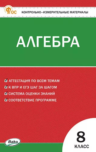 В пособии представлены контрольно-измерительные материалы (КИМы) по курсу «Алгебра» для 8 класса. Порядок тем соответствует учебнику Ю.Н. Макарычева, входящему в действующий федеральный перечень учебников. Структура КИМов аналогична структуре заданий ГИА (ОГЭ) и ЕГЭ по математике, что позволит подготовить учащихся к работе с подобным материалом. В конце издания предложены ответы ко всем тестам.