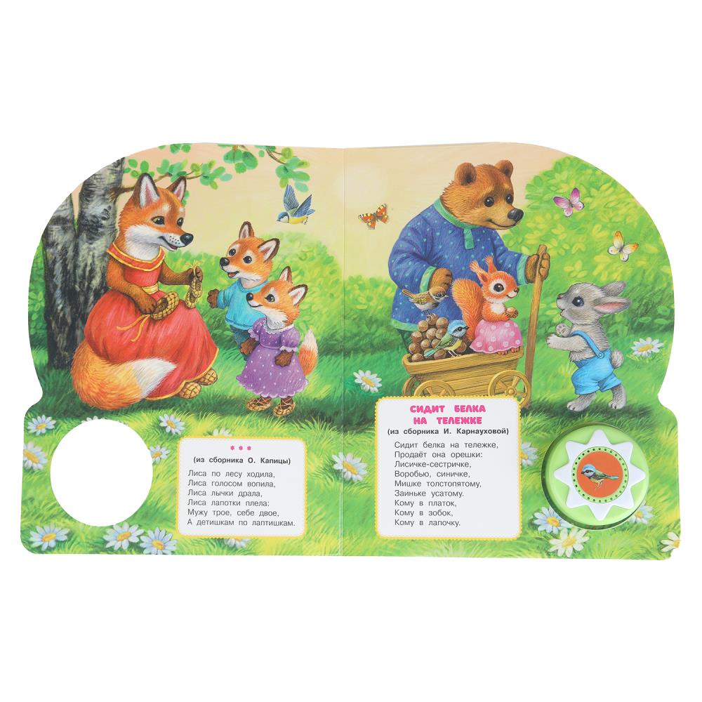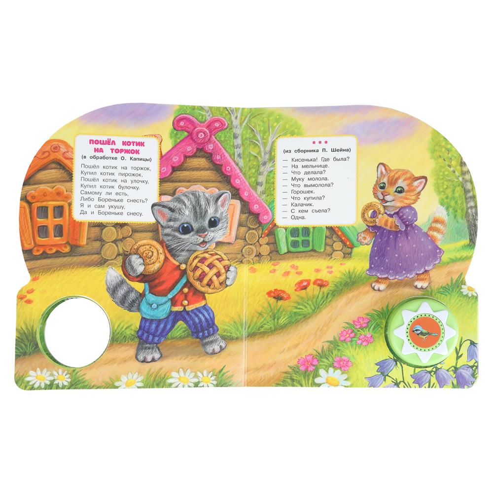Ребёнок с удовольствием будет листать плотные картонные страницы, рассматривать красочные картинки, нажимать на кнопку и слушать задорные потешки. Малыш легко освоит включение звука: при нажатии на кнопку включится первая песенка, при втором нажатии выключится, в 3-ий раз — заиграет следующая и т.д. Благодаря компактному формату книгу удобно взять с собой в дорогу.