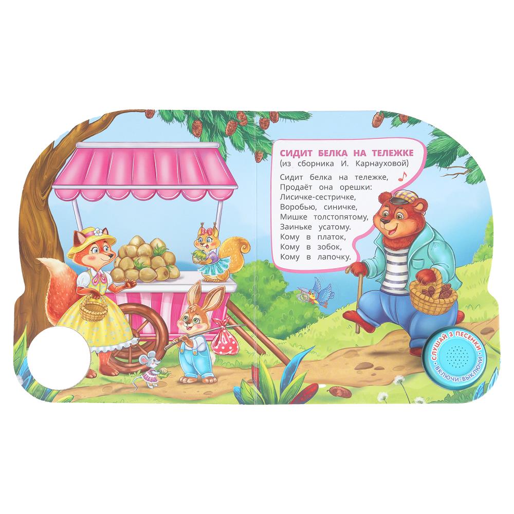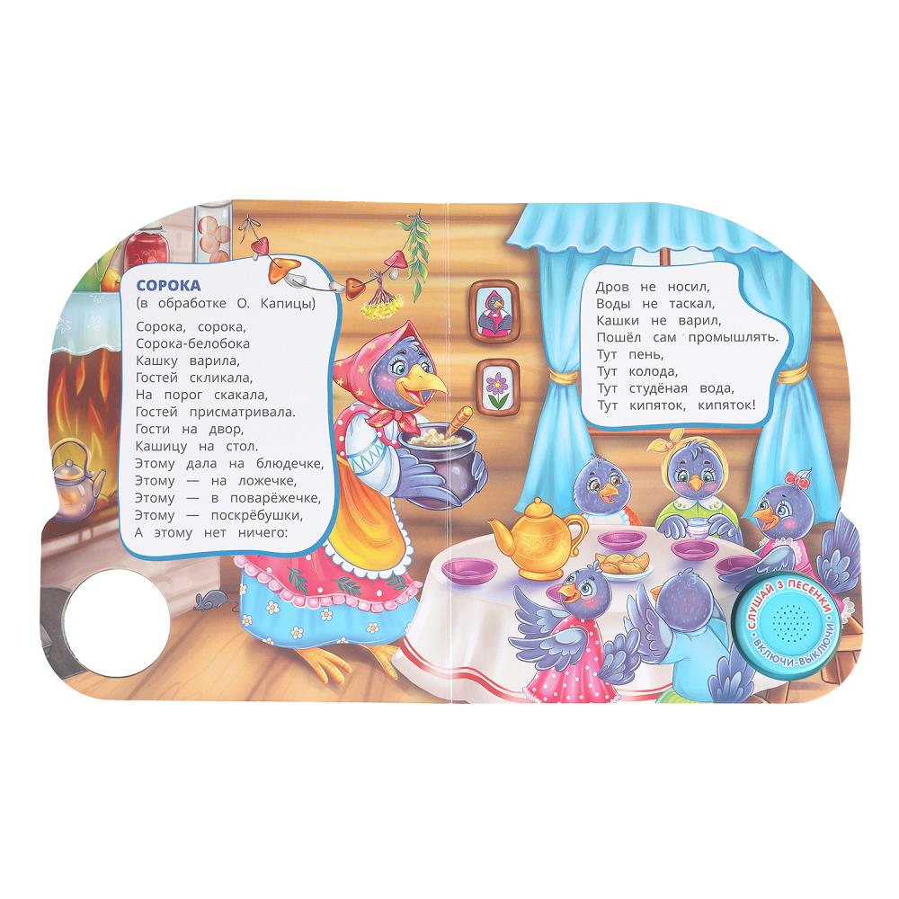 Ребёнок с удовольствием будет листать плотные страницы, рассматривать яркие картинки и, конечно, нажимать на кнопку и слушать задорные песенки-потешки. Малыш легко освоит включение звука: по нажатию на кнопку песенка включится, при втором нажатии выключится, при третьем — заиграет следующая композиция. Благодаря компактному размеру книгу удобно взять с собой в дорогу.