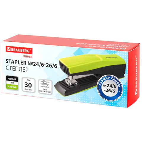 Степлер №24/6 26/6 до 30л BRAUBERG «SUPER» зелено-черный 272741