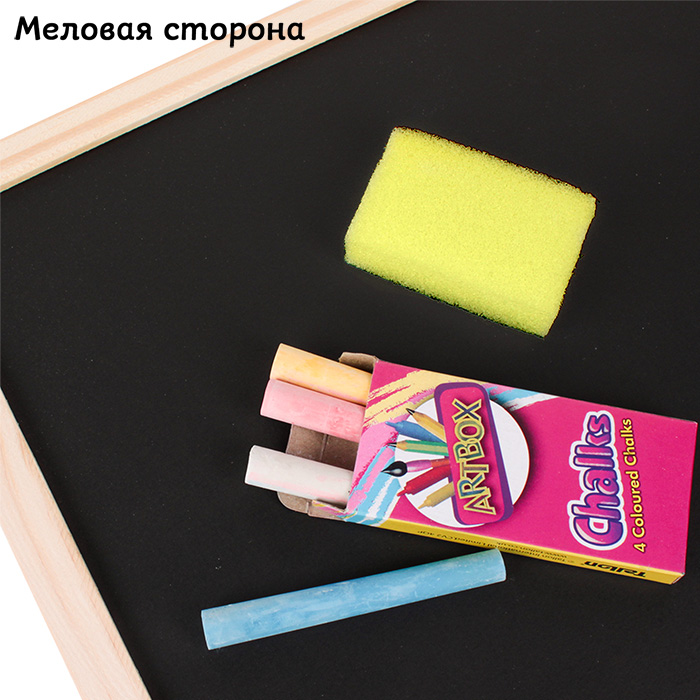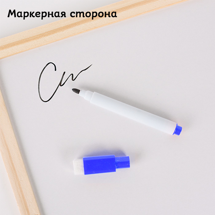 Доска для рисования двусторонняя маркерно-меловая в деревянной рамке. С одной стороны, доска имеет покрытие белого цвета для рисования маркером. С другой стороны — износостойкое черное покрытие для рисования мелками. Размер доски 40*30 см, в комплекте идут губка, маркер и 4 мелка.