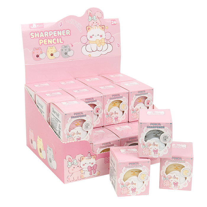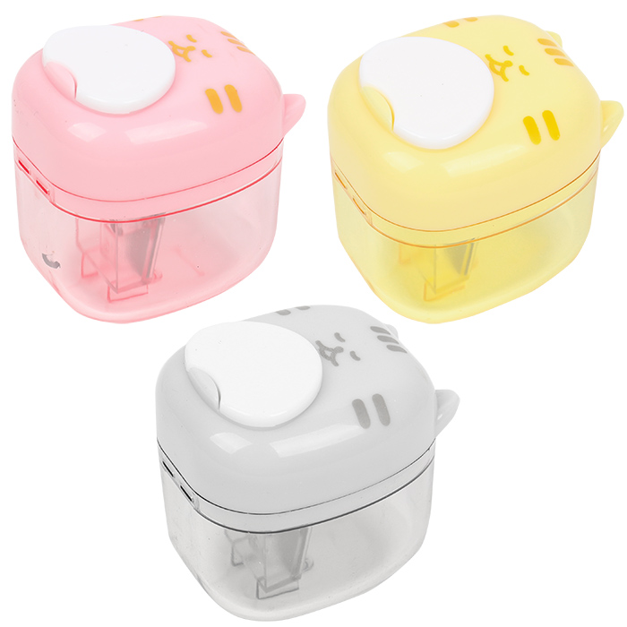 Точилка с контейнером Котик. Чтобы открыть отверстие для заточки карандашей, нужно сдвинуть белый «животик» вверх и вбок. Индивидуальная упаковка — 4,5х4,5х3,8см. Упаковка 24шт: картонная коробка 15,5х9х14см.