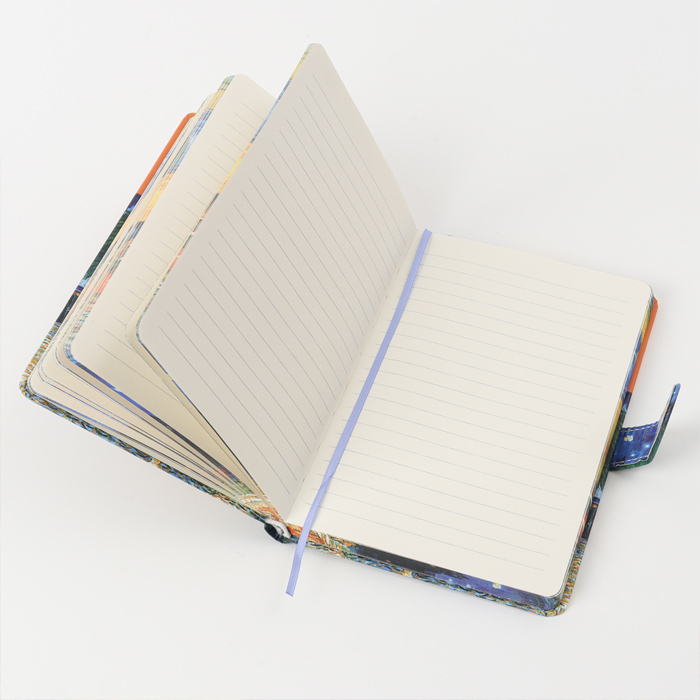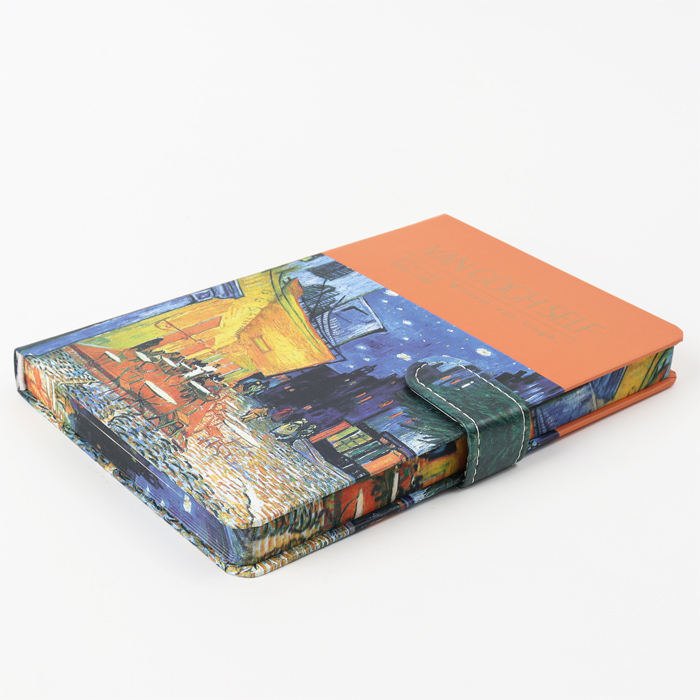 Блокнот на магнитной застежке с цветным срезом 13*19см. Закладка-ляссе. Офсет, 112л в линейку. Плотность не менее 100г/м2. Изображение с картины Винсент ван Гога «Ночная терраса кафе» 1888г. Упаковка: плёнка.