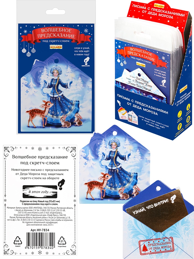 Подвеска с предсказанием, спрятанным под специальной «стираемой» краской, станет неожиданным моментом праздничного вечера или приятным дополнением к подарку. Подвеска-открытка с письмом от Деда Мороза подскажет, что же ждёт в Новом году. Размер: 95х85 мм.