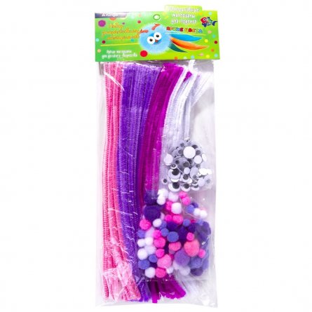 Набор для творчества Alingar Проволока пушистая-30 см 80 шт, Помпоны-90 шт, Глазки-90 шт, «Белый, розовый,сиреневый, фиолетовый»,пакет с европодвесом