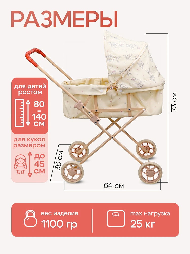 Игрушка Коляска для кукол «Заюшка» (63,5х36х73см) со съемной люлькой, в пакете (арт. 9308-NF)
