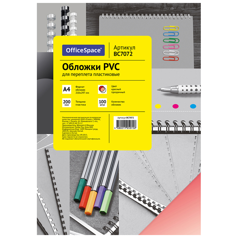 Обложка А4 OfficeSpace «PVC» 200мкм прозрачный красный пластик 100л. 7072