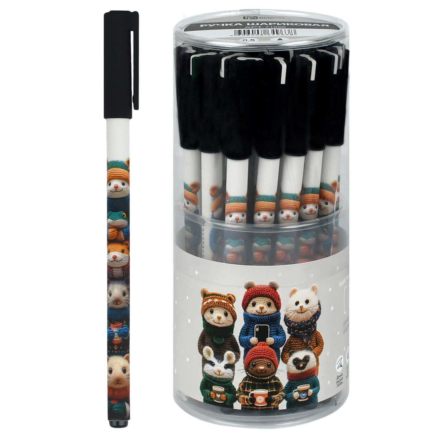 Ручка шариковая арт. 71666 / 30 ВЯЗАНЫЕ ЗВЕРИ (ПВХ тубус, 30 шт., неавтоматическая, 7×150 мм, цвет корпуса: коричневый, чёрный, материал корпуса: АБС-пластик с добавлением САН-пластика, покрытие корпуса: софт-тач, 0,5 мм, цвет чернил: синий, стержень: сменный).