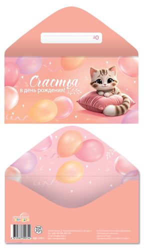 Конверт для денег на склейке КДС-17811 Счастья в день рождения! (унисекс, котик)