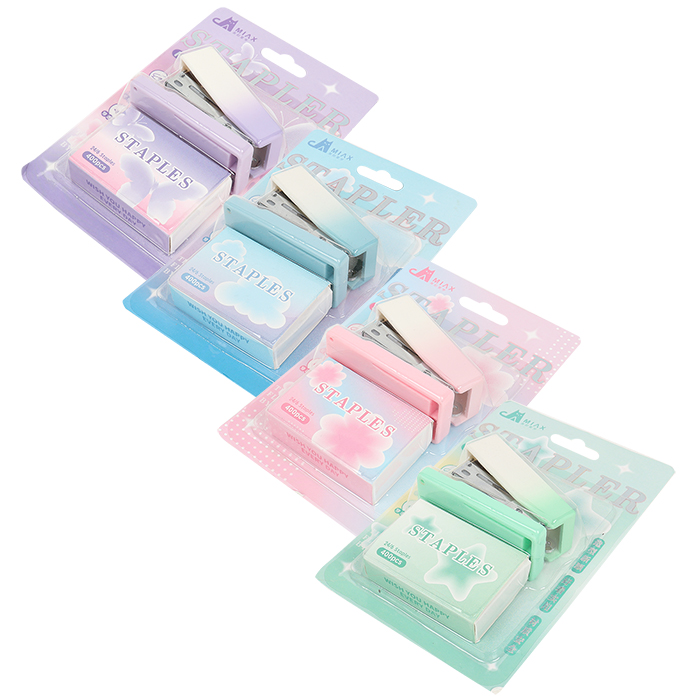Предназначен для скрепления листов бумаги металлическими скобами , сшивает до 12 листов. В наборе : степлер, скобы -400шт. Цвет: ассорти. Упаковка: блистер с европодвесом 9,5*14*3см.