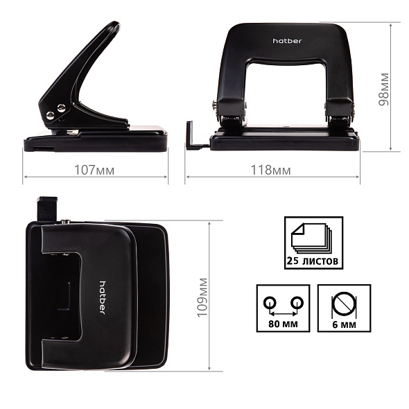 Дырокол на 25л металлический Record с линейкой Черный 092224