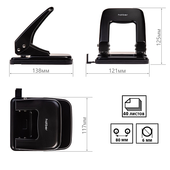 Дырокол на 40л металлический Record с линейкой Черный 092225