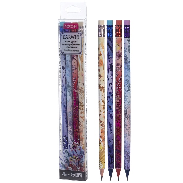 Карандаш ч/г с ластиком HB Набор 4шт Hatber Darwin круглый корпус в пластик. боксе 093399