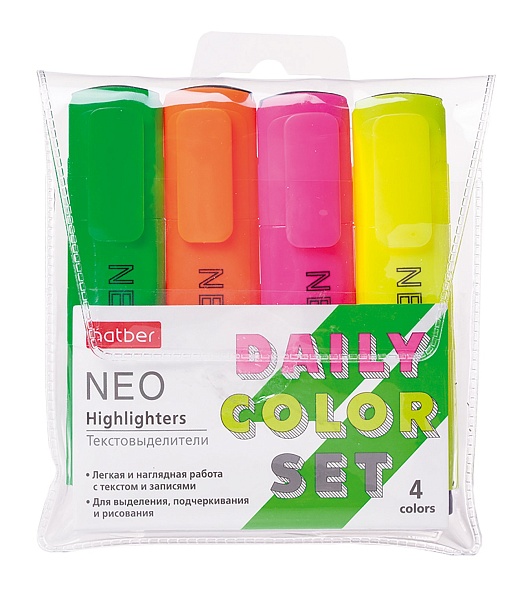 Набор маркеров текстовыделителей 4цв Hatber NEO neon клиновидный пишущий узел в прозрачном ПВХ-боксе 062058