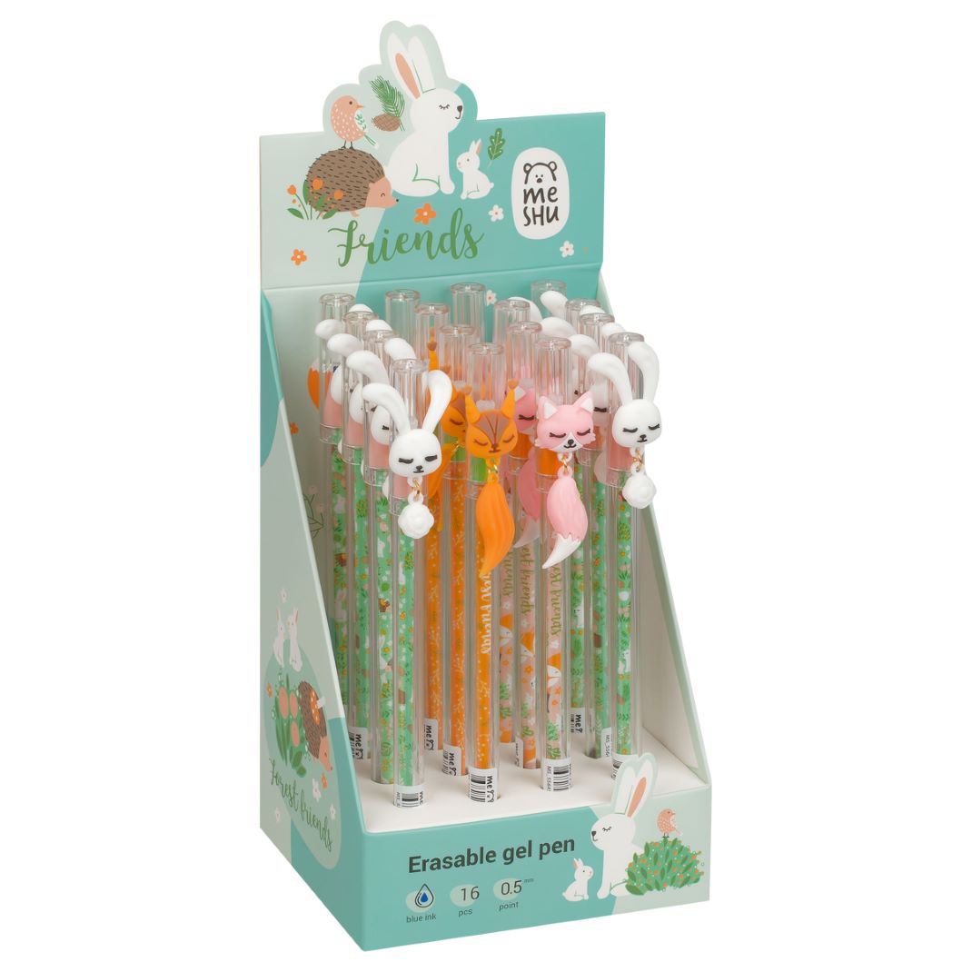 Гелевая стираемая ручка MESHU Lovely animals станет ярким атрибутом отличного настроения на работе или учёбе. Изделие обладает необычным дизайном с милым топпером-игрушкой на колпачке. Гелевые чернила не только ярко пишут на бумаге, но и при воздействии температуры становятся невидимыми – достаточно потереть написанное специальным ластиком на кончике ручки. Обесцвеченные чернила проявляются при низкой температуре. Диаметр пишущего узла составляет 0,5 мм, благодаря чему ручка прекрасно подойдёт для любого стиля письма. Толщина линии составляет 0,3 мм. Благодаря чернилам синего цвета ручку можно ежедневно использовать в работе или учёбе. Поставляются в картонном шоубоксе по 16 штук.