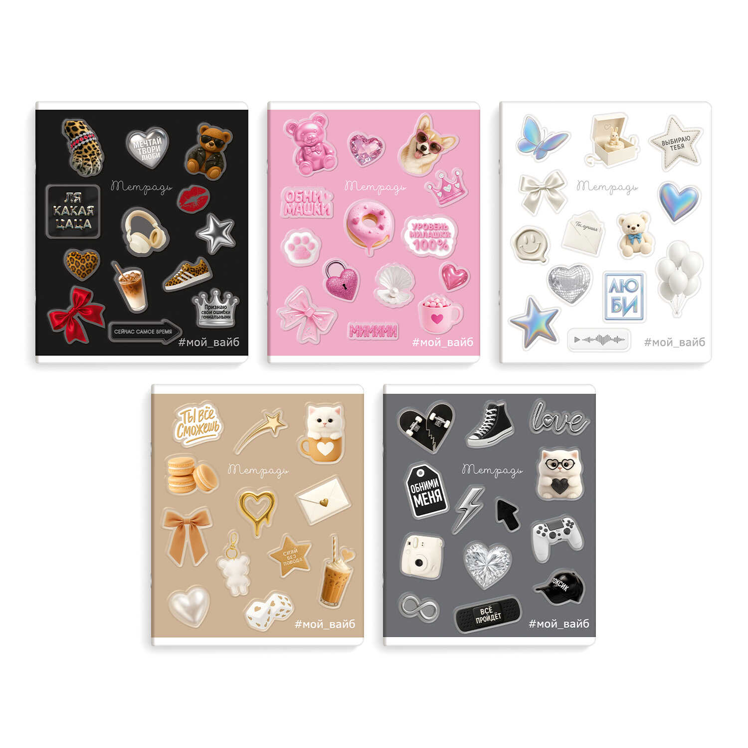 Тетрадь, 48 л, клетка, арт. 70944/ 5 СТИКЕРЫ /А5+, мягкий переплёт (2 скобы), обложка — тиснение фольгой, мелованный картон 190 г/м², упаковка ассорти