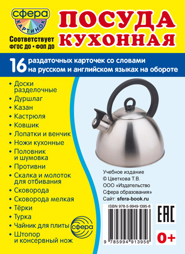 На обороте каждой карточки — название посуды на русском и английском языках.