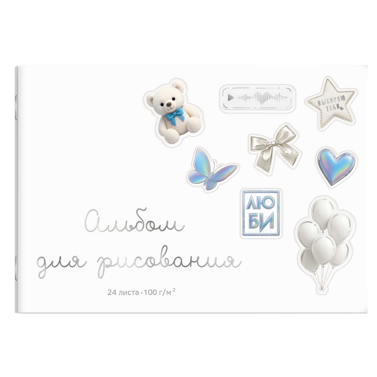 Альбом для рисования 24 л, арт. 73127 СТИКЕРЫ НА БЕЛОМ /А4 блок — белый офсет 100 г/м², обложка — полноцветная печать, тиснение фольгой, мягкий переплёт (2 скобы)