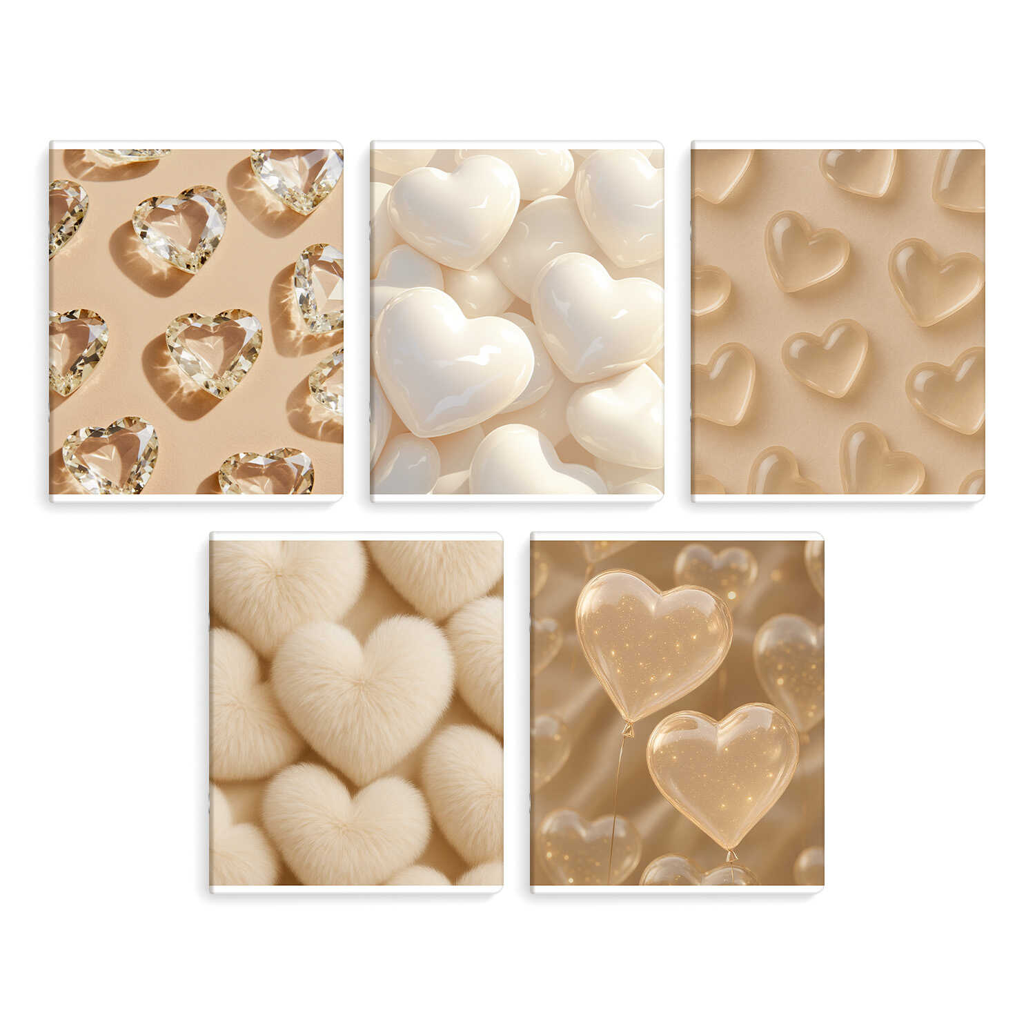 Тетрадь, 48 л, клетка, арт. 70932/ 5 БЕЖЕВЫЕ СЕРДЦА /А5+, мягкий переплёт (2 скобы), обложка — выборочный УФ-лак, мелованный картон 190 г/м², упаковка ассорти