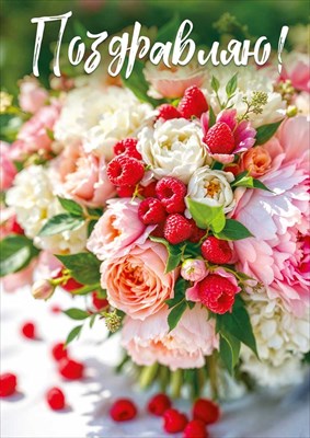 Открытка А4 «Поздравляю!» (букет с ягодами малины) текст 1407