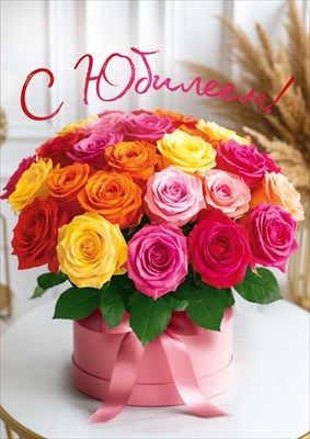 Открытка А4 «С юбилеем!» (букет роз в круглой коробке) текст 1408