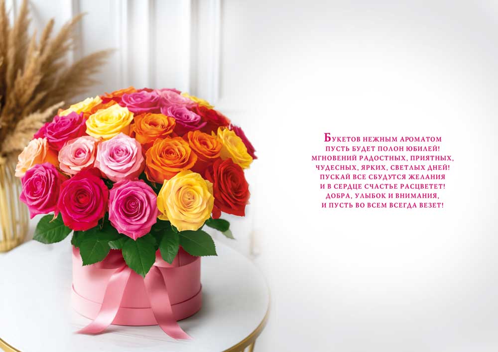Открытка А4 «С юбилеем!» (букет роз в круглой коробке) текст 1408
