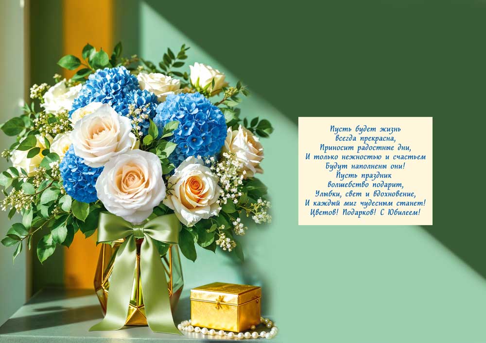 Открытка А4 «С юбилеем!» (букет роз и гортензий) текст 1409