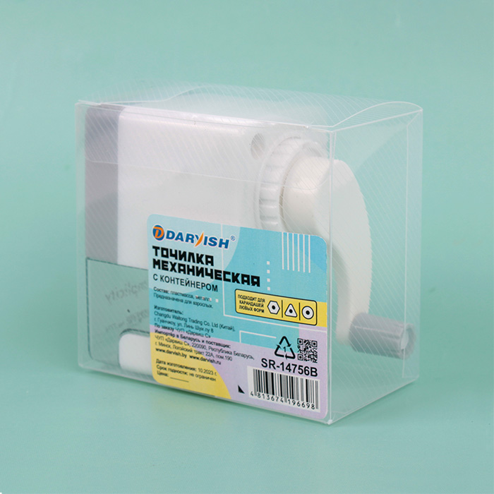 Точилка оснащена пластиковой ручкой, которую необходимо крутить для затачивания карандашей. Острые стальные лезвия обеспечивают качественную, быструю и точную заточку. Опилки от карандашей остаются в специальном контейнере. Идеально подходит для чернографитных и цветных карандашей любой формы (круглые, шестигранные, треугольные). Упаковка : плас. кор. 9*8*5см