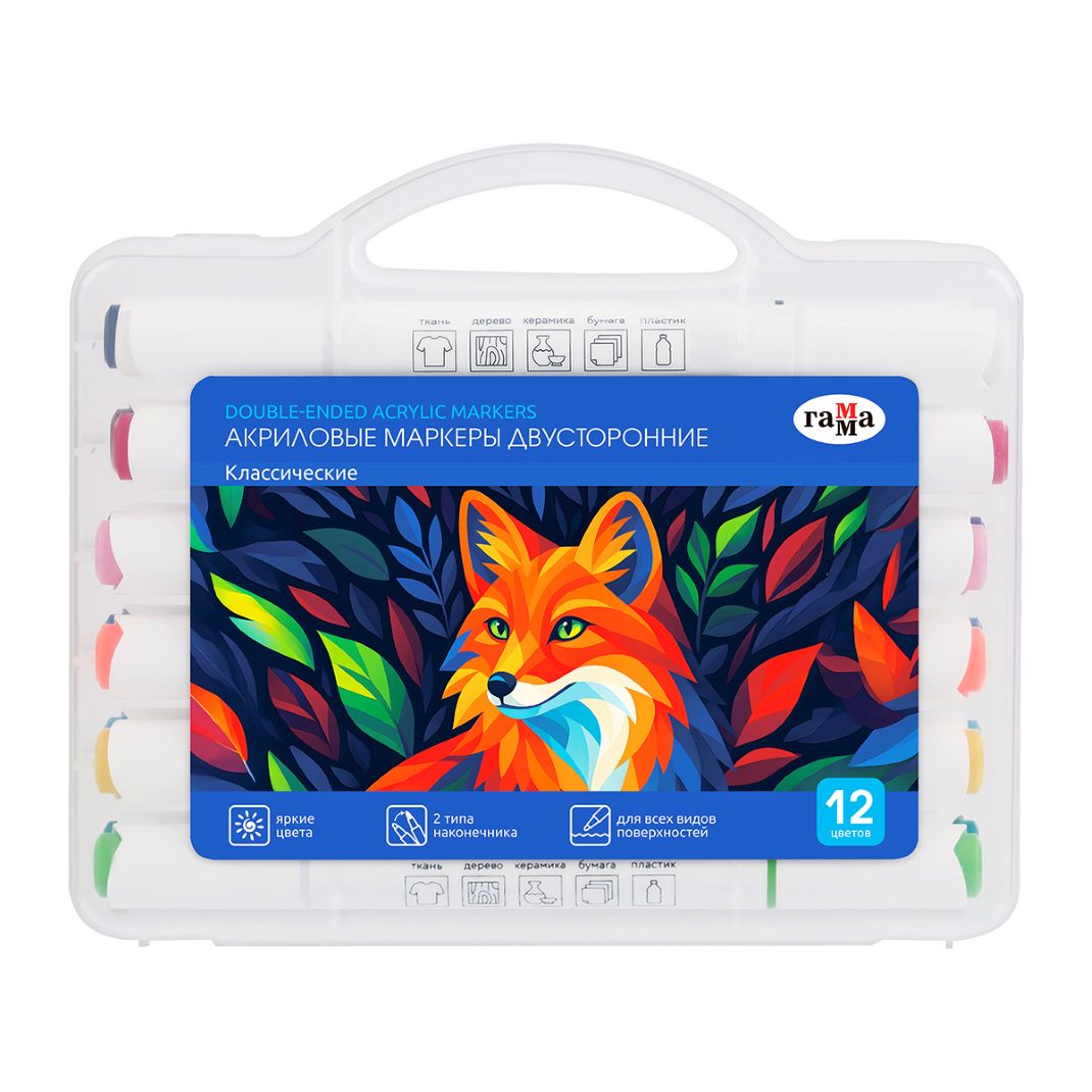 Набор акриловых маркеров Гамма серии «Классическая» для детского творчества и хобби. Набор состоит из 12 маркеров. Износостойкий наконечник из нейлона. На колпачке и корпусе вставка, обозначающая цвет чернил. Нумерация цвета на колпачке. Количество цветов: 12 цветов. Толщина линии – 1-6 мм, форма наконечника – кисть и пуля. Высокие укрывные свойства и стойкость после высыхания. Не требуют активации. Маркерами можно рисовать на различных поверхностях: бумага, ткань, дерево, камень, пластик, стекло и т.д. Набор в пластиковом кейсе с ручкой и ячейками для каждого маркера.
