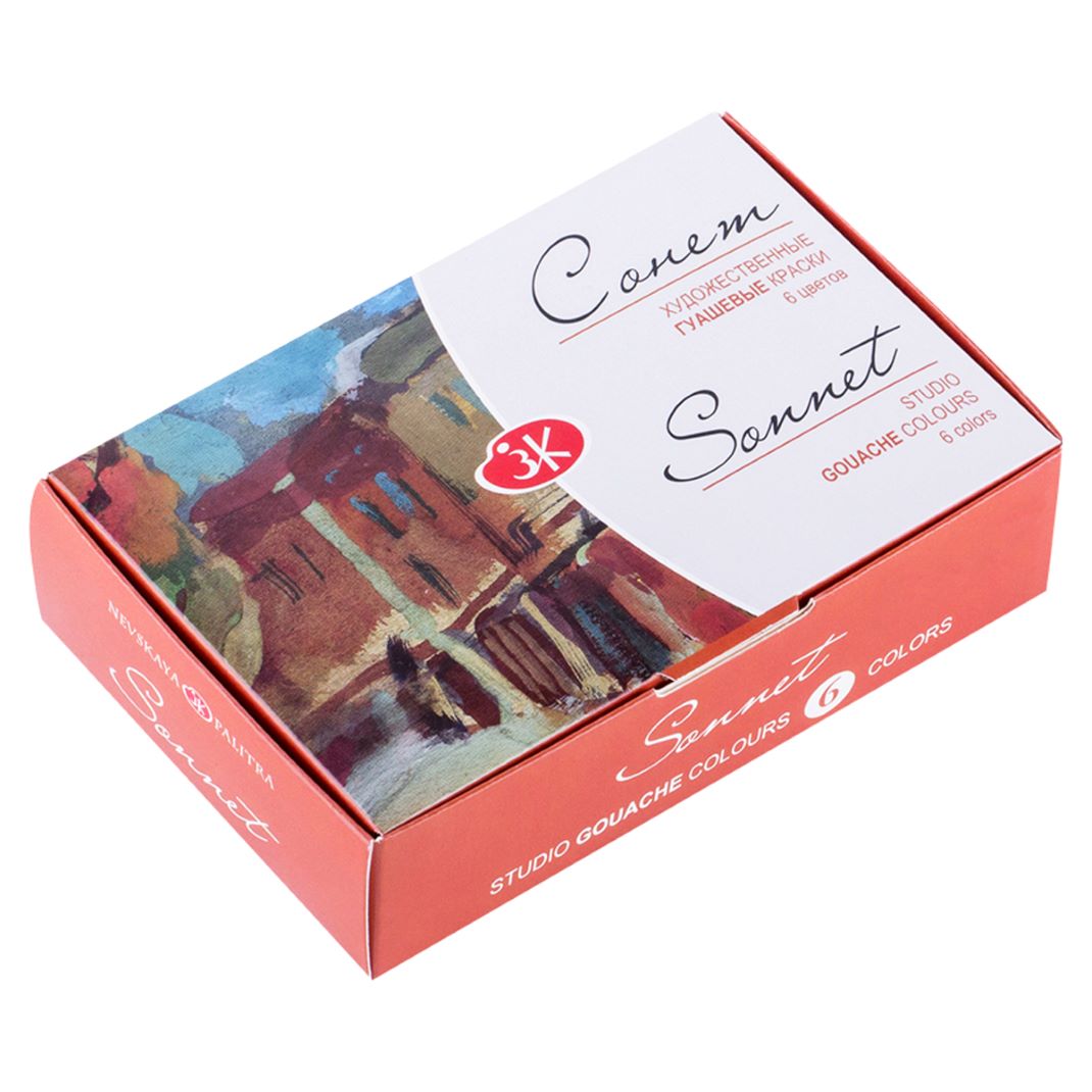 Художественные гуашевые краски «Сонет» предназначены для создания учебных работ, макетов, декора и иллюстраций. Краски изготовлены по новой технологии с применением пигментных паст и синтетического связующего. Обладают высокой укрывистостью. После высыхания приобретают бархатистую матовую поверхность. Палитра гуашевых красок в наборе «Сонет» состоит из 8 базовых цветов, необходимых начинающему художнику для работы.