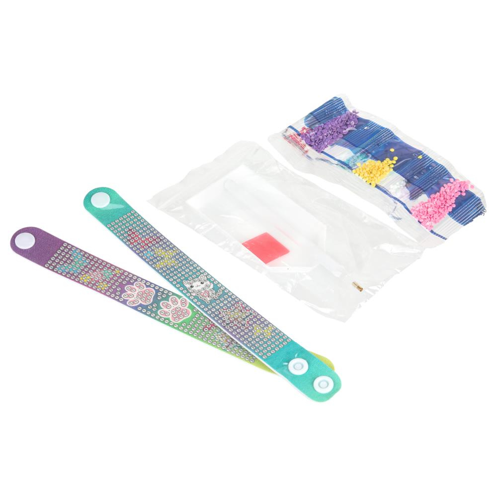 При помощи этого набора юная умелица сможет создать два стильных украшения на руку, декорированных сверкающими стразами. Красивые блестящие браслеты помогут разнообразить ежедневный образ девочки или станут отличным подарком, сделанным собственными руками, для её подруг.
