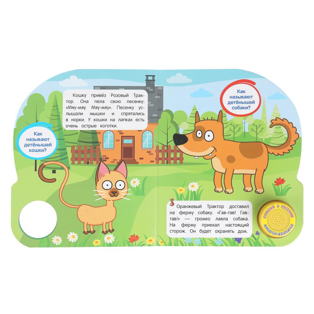 Ребёнок с удовольствием будет листать плотные страницы, рассматривать красочные картинки с изображением героев популярного мультсериала, читать про обитателей фермы и, конечно, нажимать на кнопку и слушать весёлые песенки. Малыш легко освоит включение звука: по нажатию на кнопку песенка включится, при втором нажатии выключится, при третьем — заиграет следующая композиция. Благодаря компактному размеру книгу удобно взять с собой в дорогу.