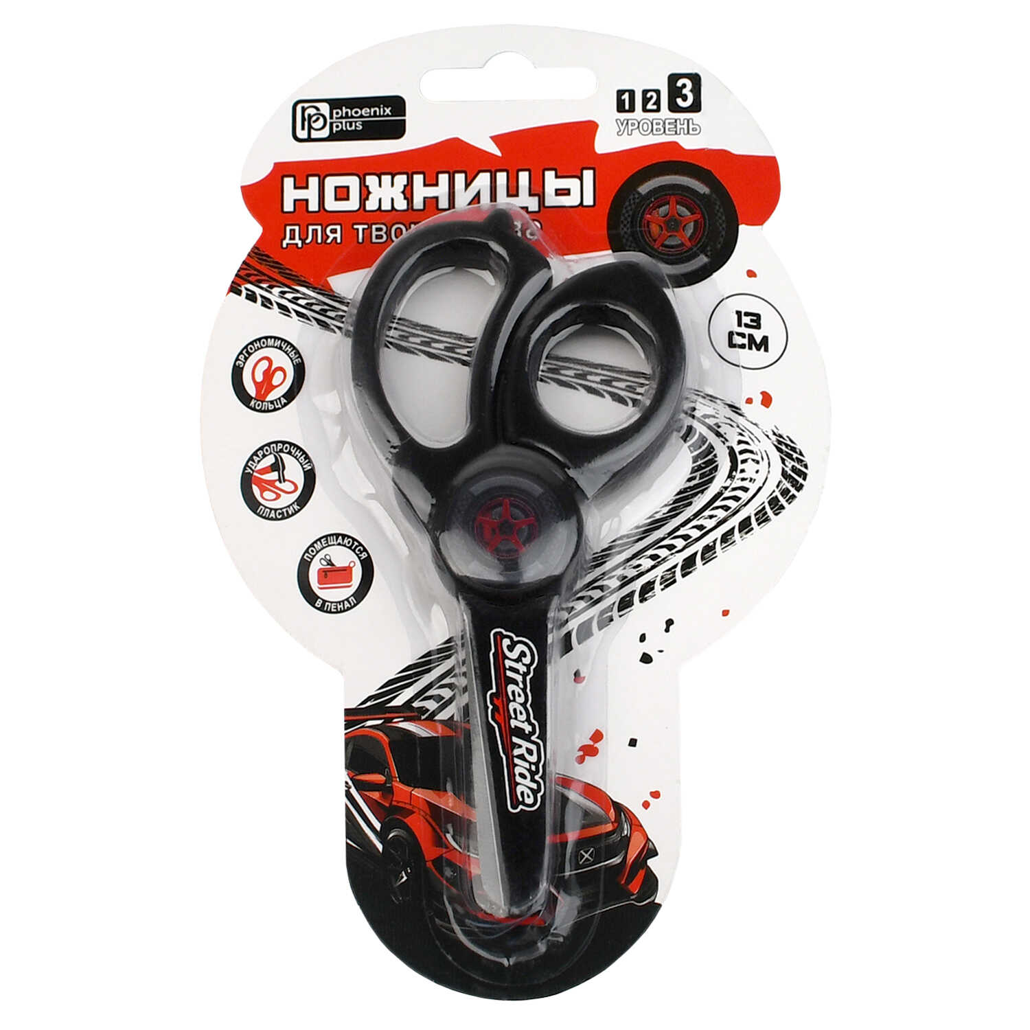 Ножницы для детей Феникс+, арт.72870/ 24 ГОРОДСКИЕ ГОНКИ (чёрный, 13×5,6 см, нержавеющая сталь, асимметричные, универсальные, блистер с европодвесом)